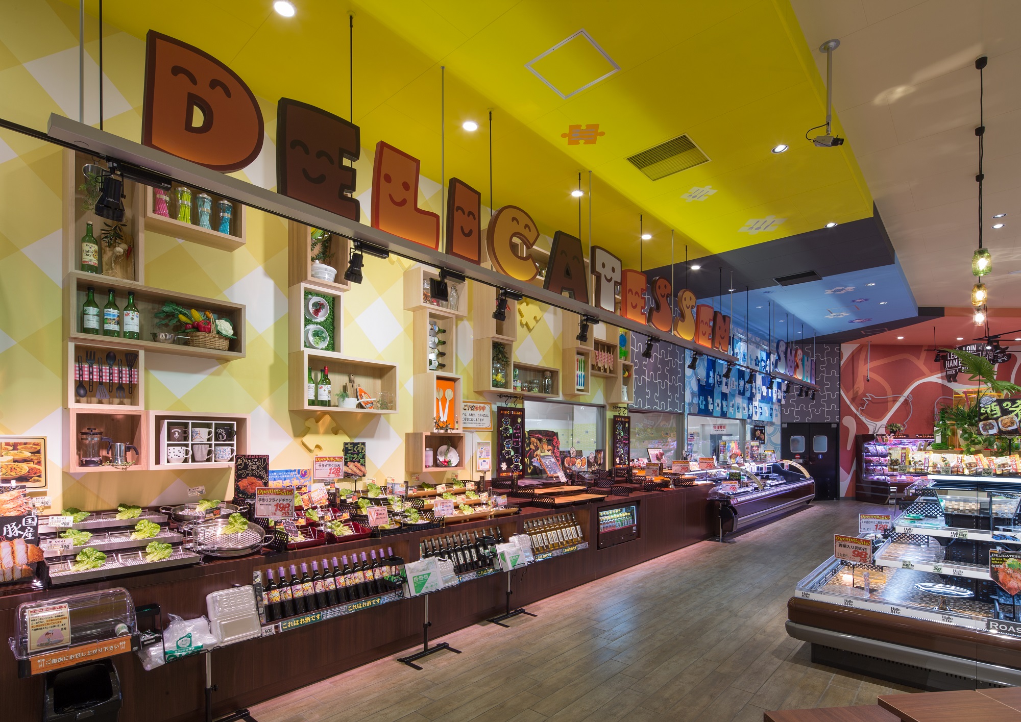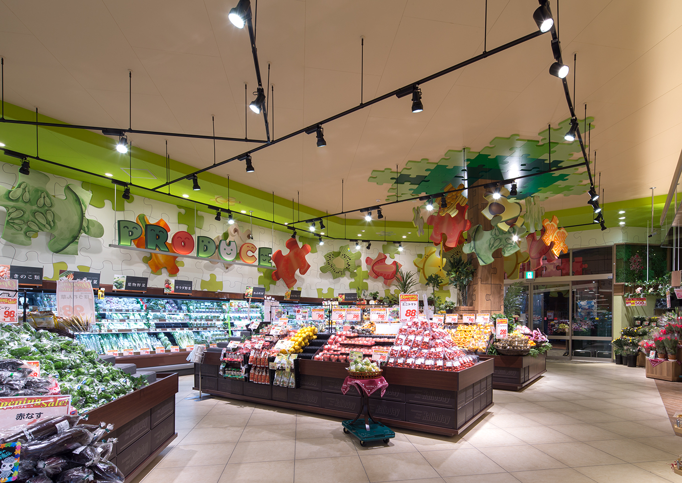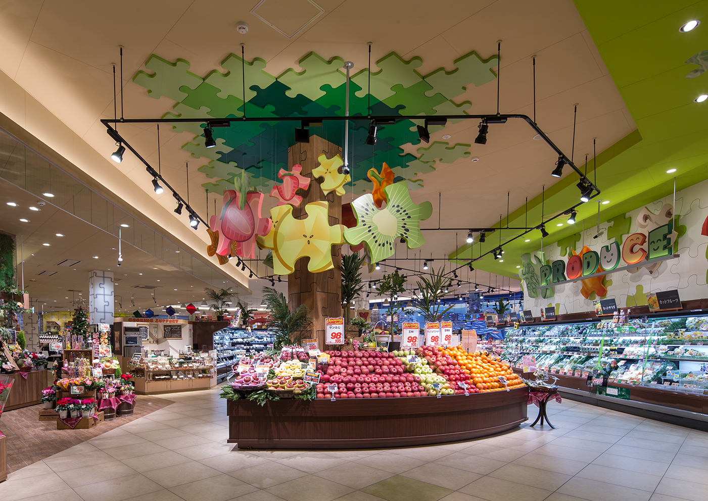 Puzzle 被选为设计概念,将古河市这座“互联、活泼、舒适、安全的城市”与 Hello Day 联系起来,Hello Day 的政策是“通过食物连接幸福,通过微笑连接心灵”。每个销售区都设有独特的展示,想象顾客选择食材并制定有趣的膳食计划。我们创造了一个商店空间,可以通过令人兴奋的购物来取悦当地顾客。