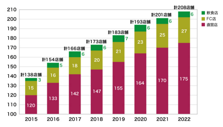到2022年底,直营店铺175个,加盟连锁店27个,餐饮店6个,合计208家店铺,属于小而精的特色化存在。