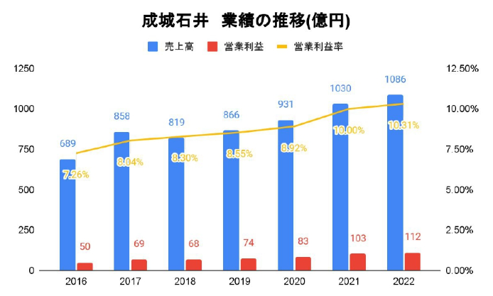横轴为年度,竖轴左侧/蓝色为销售额(亿日元),右侧/黄色为销售利润率,红色为销售利润