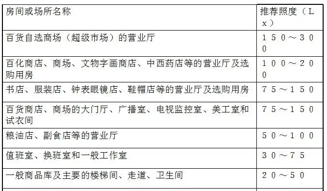 各类商店建筑的一般照明,在距地面0.80m参考水平工作面处的推荐照度值可参照表