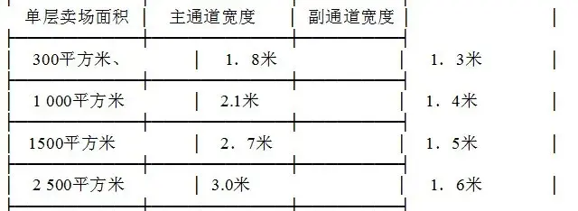 所谓足够的宽,即要保证顾客提着购物筐或推着购物车,能与同样的顾客并肩而行或顺利地擦肩而过。不同规模超市通道宽度基本设定值如表