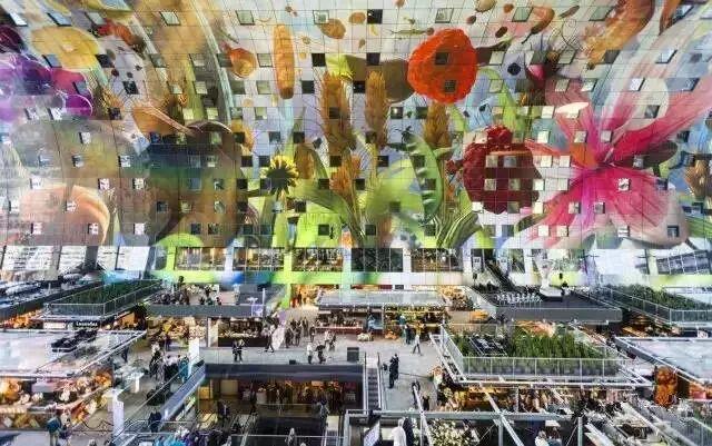 其实,这是荷兰鹿特丹的Markthal缤纷菜市场!其内部采取透明商铺的形式,视觉上更显空间辽阔,心理上给人们干净整洁的感觉。想一想,一个卫生安全的市场,里面有着最新鲜的食材,这不我们梦寐以求的菜市场嘛?也正因此,不到一周的时间,便有100万人千里迢迢来参观!