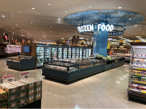 让顾客到感受店内购物的乐趣,在布局上,改变原来的沿墙壁的动线设置,将货架与主通道的墙面进行斜线配置,增强卖场巡游性。并且在各个品类大量运用色彩和装饰,提升视觉效果,为卖场增添娱乐氛围,有效延长顾客在店内的购物时间。在与顾客的交流互动方面,在水产区增设面对面的销售柜台,加强店员与顾客的对话互动;增设试吃柜台,打造顾客在店内品尝美味、享受饮食乐趣的场景,并由店员为顾客解说商品特征和烹饪方法等。