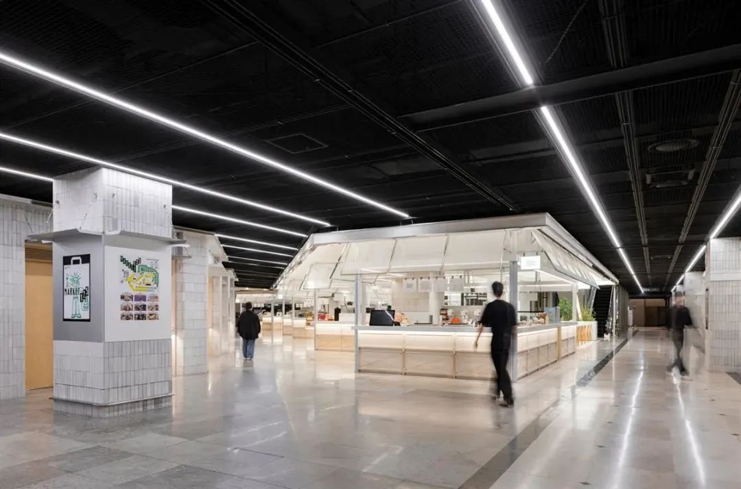 日市的设计则更加注重明亮和阳光充足的氛围营造。遮阳篷的设计不仅提供了必要的遮阳功能,还投射出柔和的阴影,为顾客带来舒适的就餐环境。从天花板透过的光线自然地将人们的视线引向小巷尽头的宽阔广场,营造出一种热闹且吸引人的场景,让人流连忘返。
