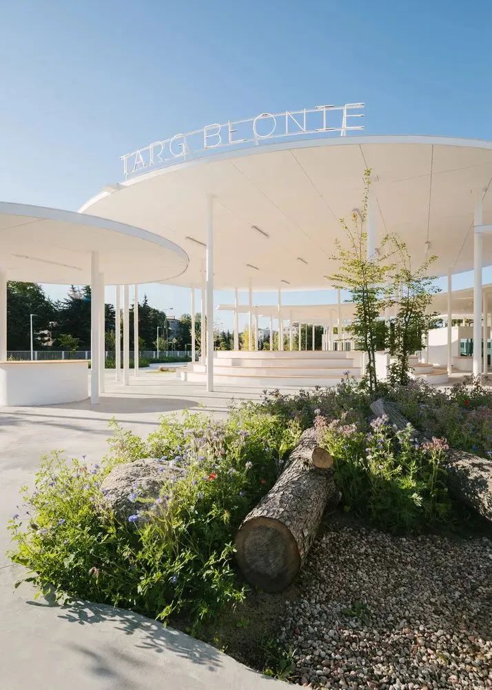 市场的重建项目包括创建一个结合两种社会功能(公园和集市)的混合公共空间。多功能的白色屋顶可以反射光线及挡雨。收市后,带有木台面的阶梯式商户展示台可用作座位和自发聚会的空间。在屋顶外围之下,外立面覆盖着白色波纹板的商店和服务亭设有落地窗门面。