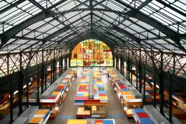 从富有艺术性的彩色玻璃拱门到每个摊位别出心裁的排列摆放与颜色搭配,无一不透露出西班牙浓厚的艺术底蕴。