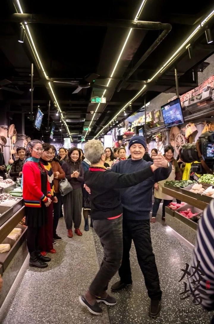 3.在小食区旁边,一个老年、中年、青年都可以使用的小舞台被建立起来。如果小食区旁边的舞台是一个固定的舞台,菜场里的其他空间就是一个灵活且具备多样可能的舞台:在基本无人买菜的下午时间,菜场里的叔叔阿姨们自发跳起了菜场舞。来打卡的年轻人看到了也不甘示弱,与阿姨们进行了一场PK,整个菜场的氛围瞬间被点燃。