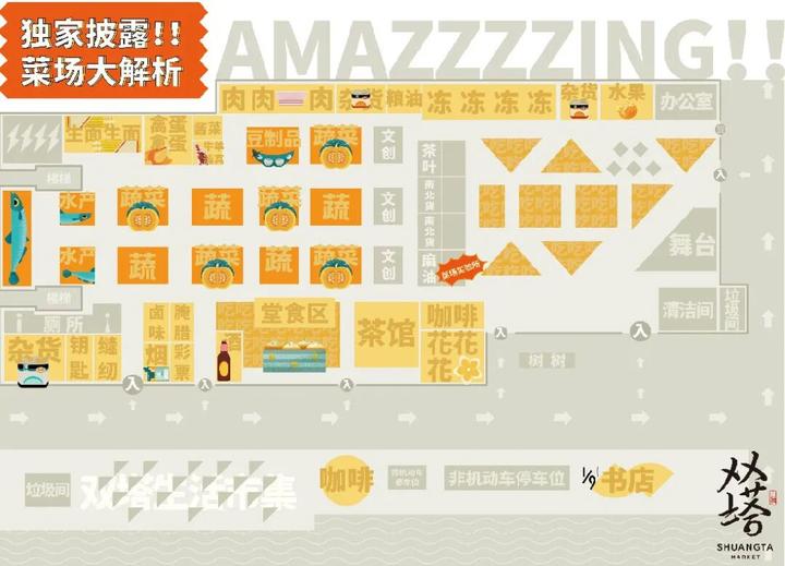 ④提高业态多样性,适当缩小蔬果生鲜销售区域面积,同时增设小吃区;同时为了容纳多种业态提供了可能性,为后续引入图书、咖啡、小食、文创、演出等业态奠定基础;在市集内还有一个可供表演的小舞台,这也使双塔市集的功能得到了无限的延伸。
