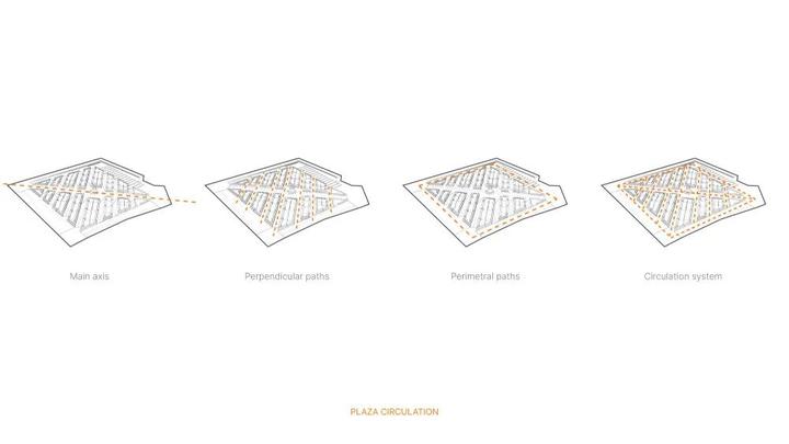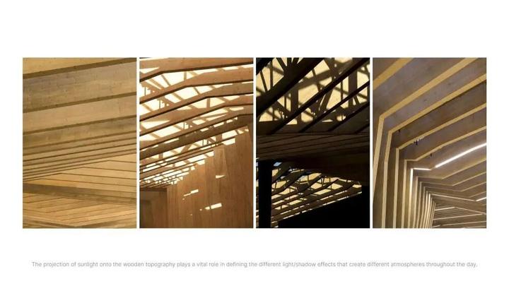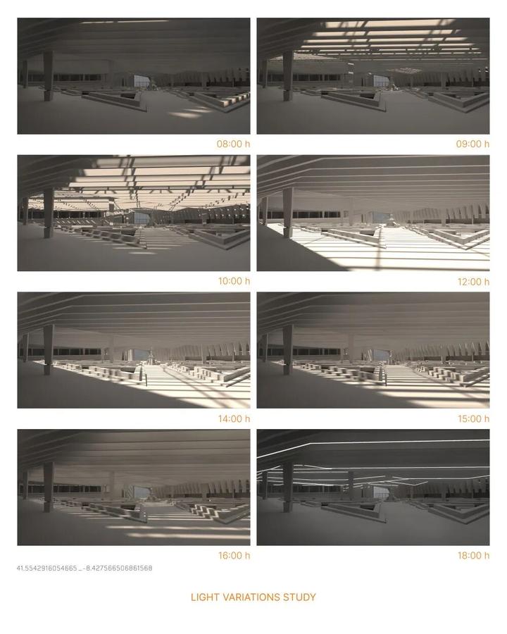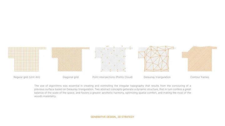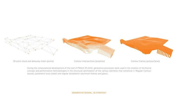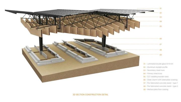 对于屋顶的设计,使用了正式探索的生成过程,这使得简化这一阶段和参数化方法以优化其元素成为可能,这为旨在现场预制和组装的过程提供了自信。使用规则的轮廓(木材)、参数化桁架(金属)和规则的镶嵌(玻璃),算法的使用对于创建和包含屋顶动态结构的规模至关重要。在构造层面上,选择了钢结构来支撑玻璃覆层,以及非结构性遮阳梁和木材中的声学偏转,其几何形状通过对流促进空气循环。