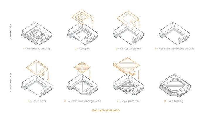 对建筑的正式干预与新区域和新功能流直接相关。在现有的三翼“U”形建筑中,改建(隔间化和立面)是适应性的,利用其原有特征并使其适应其目的而不损害其原始阅读,所有正面都是商店被定向到中央广场。在成为新的互动中心的中央广场,干预更深入、更有影响力。