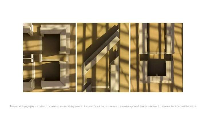 原来的广场被分成两个大空间:宽阔的周边走廊和较低层的中央核心。它们之间的高度差异通常源于摊位的零散排列,需要个性化的庇护所,使整个空间的感知变得混乱和混乱。