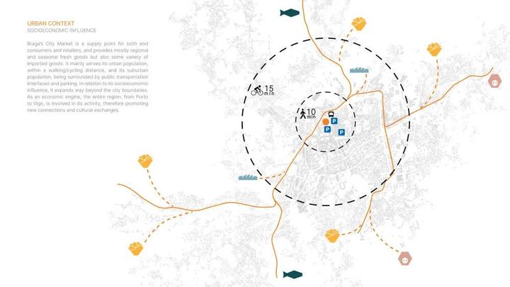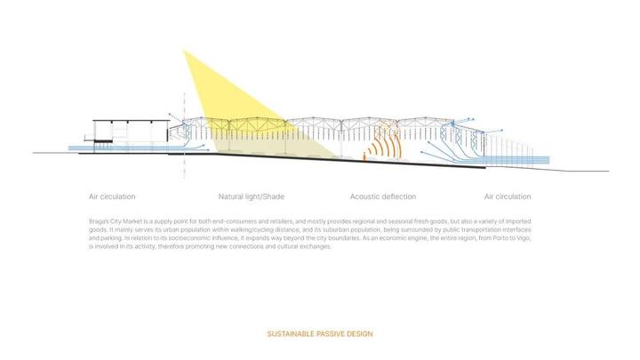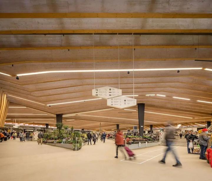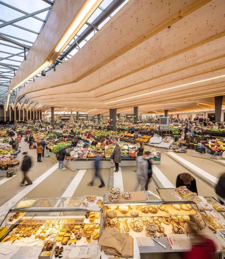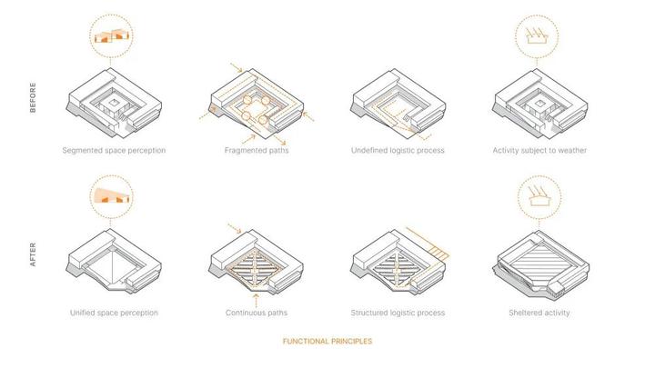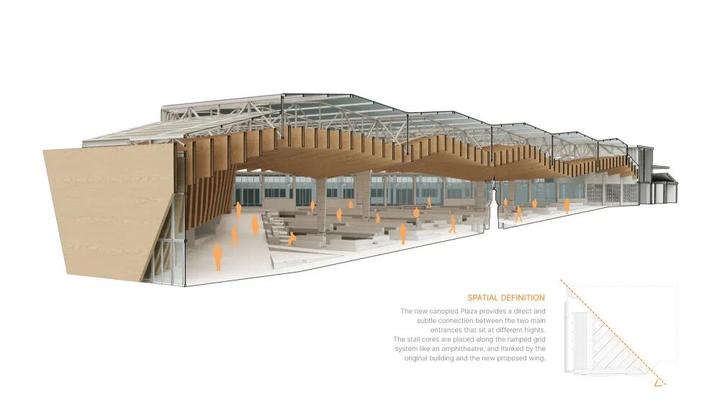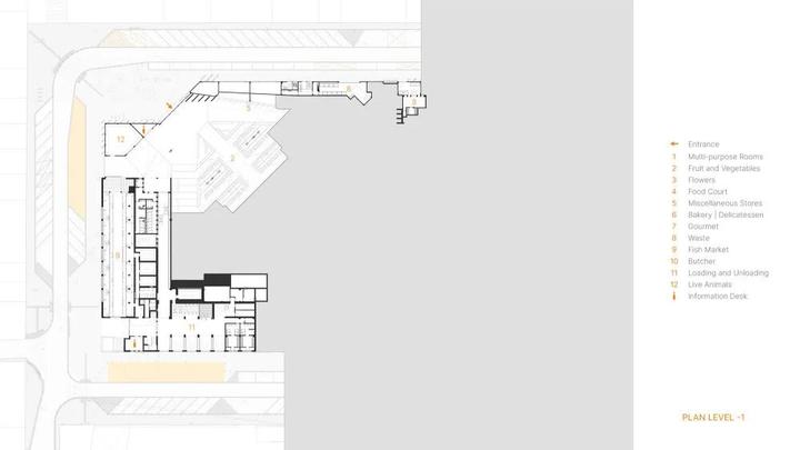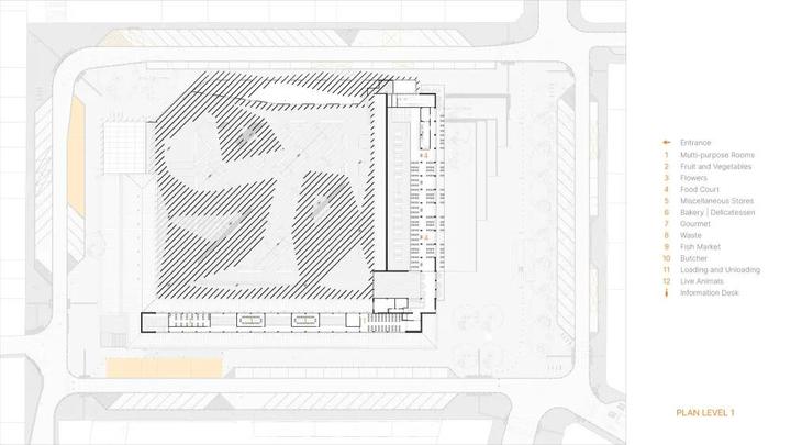 公共区域最初分散在整个建筑中,现而集中到广场中央,从那里用户可以眺望、浏览并快速到达任何一个摊位。这使得人们可以轻松地体验整个市场,并增加买卖双方之间建立新联系的可能性。所有服务支持区域与公共路线分开;新鲜水蔬区(脏乱)和熟食区(干净)的线路也被分开,并增加了新的功能以获得更高效的操作流程与更严格的卫生条件:装卸发货在一个区域进行,并为接下来的处理工作准备了废物处理流程,还为特定部门增加了技术区域,例如切割厂、烟熏房、减工厨房和专用制冰装置。