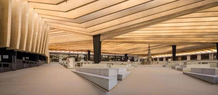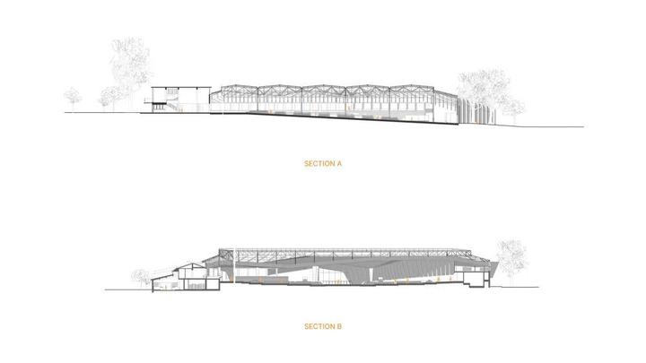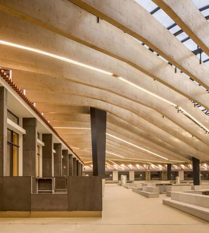 因此,除了实现统一、和谐和温馨的空间目标外,还有技术和功能问题需要解决。由连接两个公共通道的骨干产生,创建了一个分层的坡道系统,解决了现有的不均匀性,消除了流动性障碍并促进了后勤运作。为了连接走廊,预制混凝土摊位的各种核心被布置在圆形剧场中。