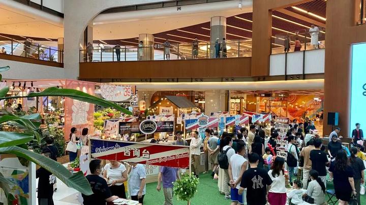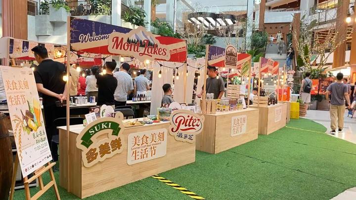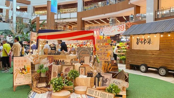 🔺瑞虹天地自今年3月始推出市集IP【太阳吉市】,结合项目的餐饮品牌优势外部平台,先后举办了“有花头”、“来撒野”、“瓶行宇宙”、“心情酒事”,“国风酒会”等多个美食美酒主题特色市集。在上个周末碰到的,则是美式精酿啤酒与美国特色菜肴相结合的“美食美刻生活节”,现场通过踢踏舞、草编舞等舞台表演及互动,微醺体验感充分。