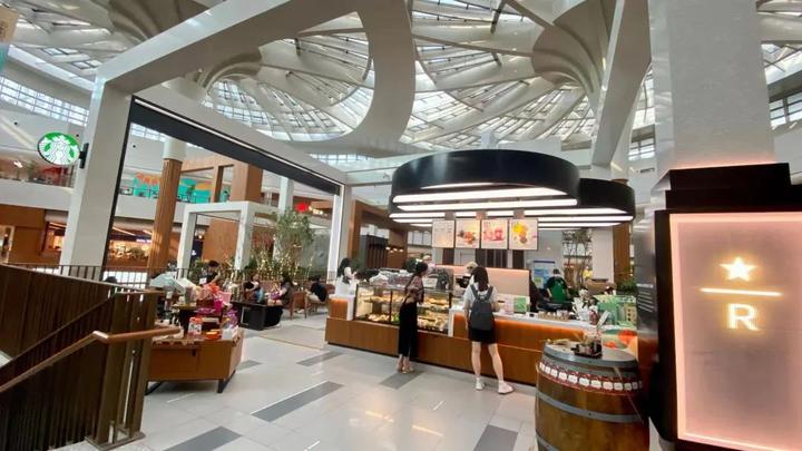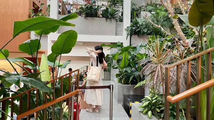 🔺顺着大台阶走上空中楼阁-星巴克,这里不仅视野绝佳,可以欣赏楼下舞台表演、可以和密友坐下畅聊,让我甚感惊奇的是,走在穹顶之下,竟感受到清风徐徐,拂动枝叶,像是户外不知从哪个地方悄悄吹进来的自然风,绝不是直愣愣的空调风(我自认为如此,如若不信可以现场感受一番)。