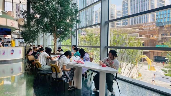🔺胡子大厨、陈香贵、成都你六姐、肥汁米兰、赖麻子秤盘麻辣烫等有就餐区域的店铺规划在内侧,门面高大,且以浅色木质门头统一装潢。
