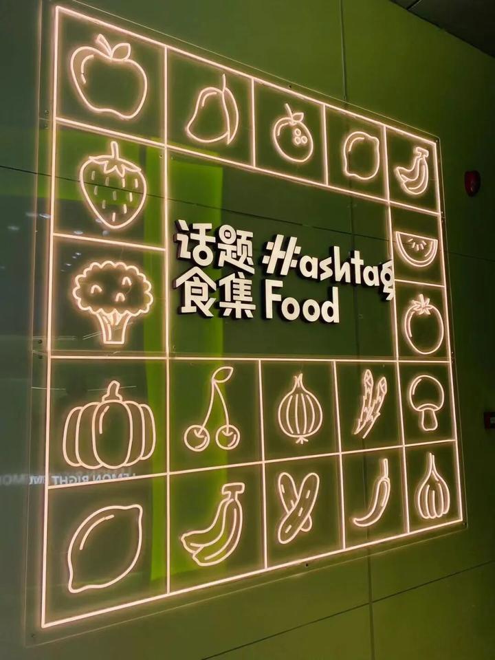在上海·万科天空之城的二楼,靠南侧有一个美食空间,叫#HashtagFood,就挂在室内主入口的环形吊顶之上。立柱LED屏动态播放着话题食集的宣传视频,开始有点好奇,这是个什么样的餐饮空间,要做一个专门的视频来包装介绍🤔。
