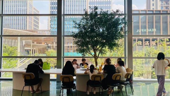 空间位于二楼,却似乎打通了二三楼的层高,整体色调以淡淡的抹茶色和原木色为主,天花以大小形状各异的白色吊灯高低错落悬挂着,透过整面玻璃幕墙,室外风光尽览无遗,阳光倾洒而下,公共餐桌旁的一棵小树正在生长伸展,整个空间就显得十分通透、有呼吸感。