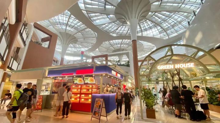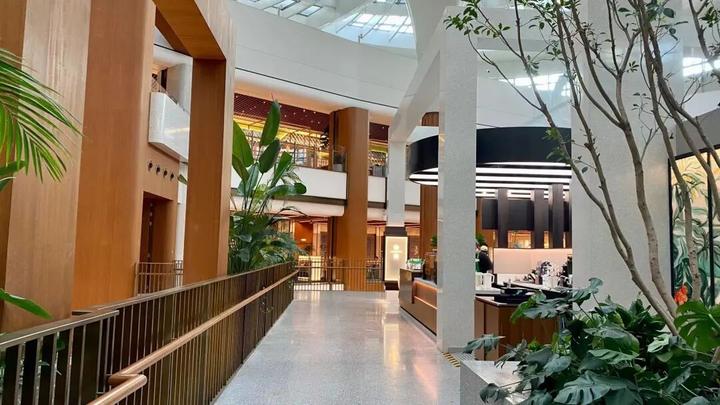 🔺25米挑高的中庭空间,阳光屋顶、有穿透性的浅绿色网架营造为餐铺结构、高矮不一的绿植散布在空间各处,错落有致。