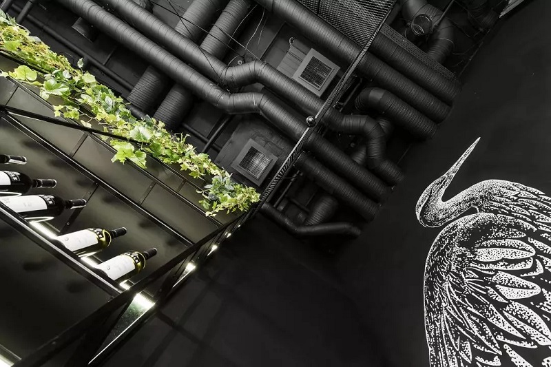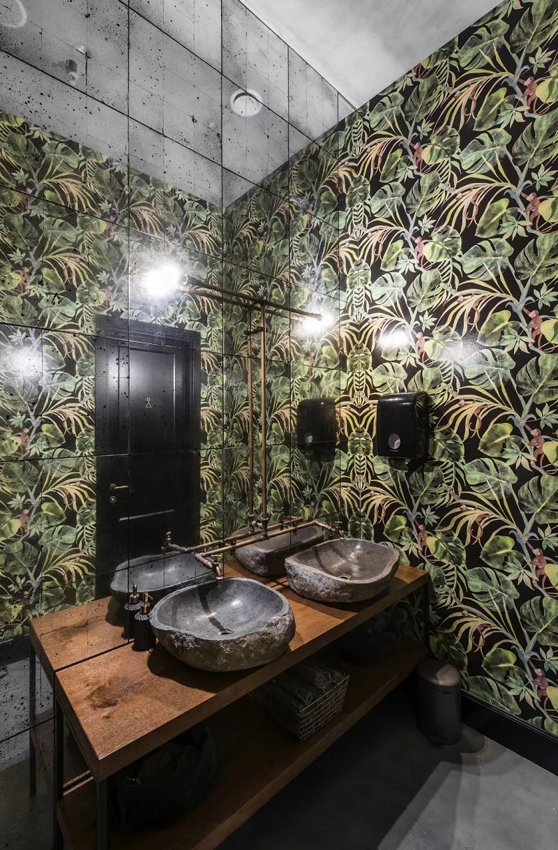 餐厅上下两层,黑色墙面上绘制禽鸟,让空间不会寡淡,也更具艺术感。而卫生间墙面同样布满各色植物,仿古的洗手盘与黄铜水龙头相互结合,别有一番意趣。