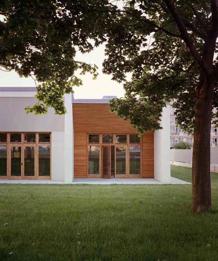 有序排列的教室组成了一个梯形模块,围合出一个新的操场作为休闲活动场所,考虑到孩子们在静态时的行为感知,设计团队通过倾斜的屋顶来达到通风照明的目的。公共走廊让教室和城市之间形成了过渡,改善了与城市环境之间的联系,可伸缩的百叶立面可根据需要随时开合,在不阻碍视野的前提下带来了充足的采光。