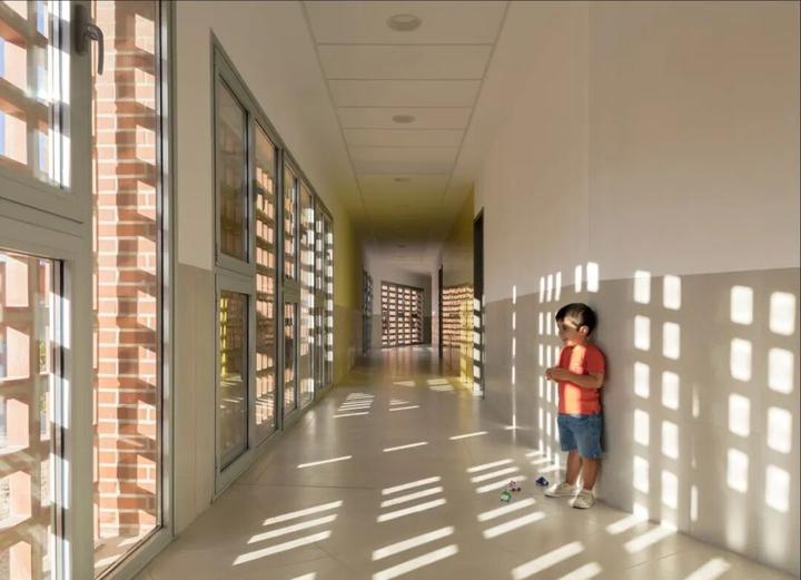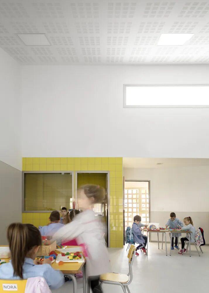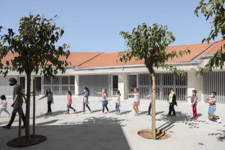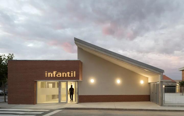 这座位于西班牙的儿童学校是为3-6岁的孩子设计的,建筑仅有一层,包括教师、操场、食堂、办公室和公共服务设施等。在项目开始之前,设计团队对儿童的意识行为进行了分析,根据分析数据来划分空间,这在建筑的外部形态中也有所体现。