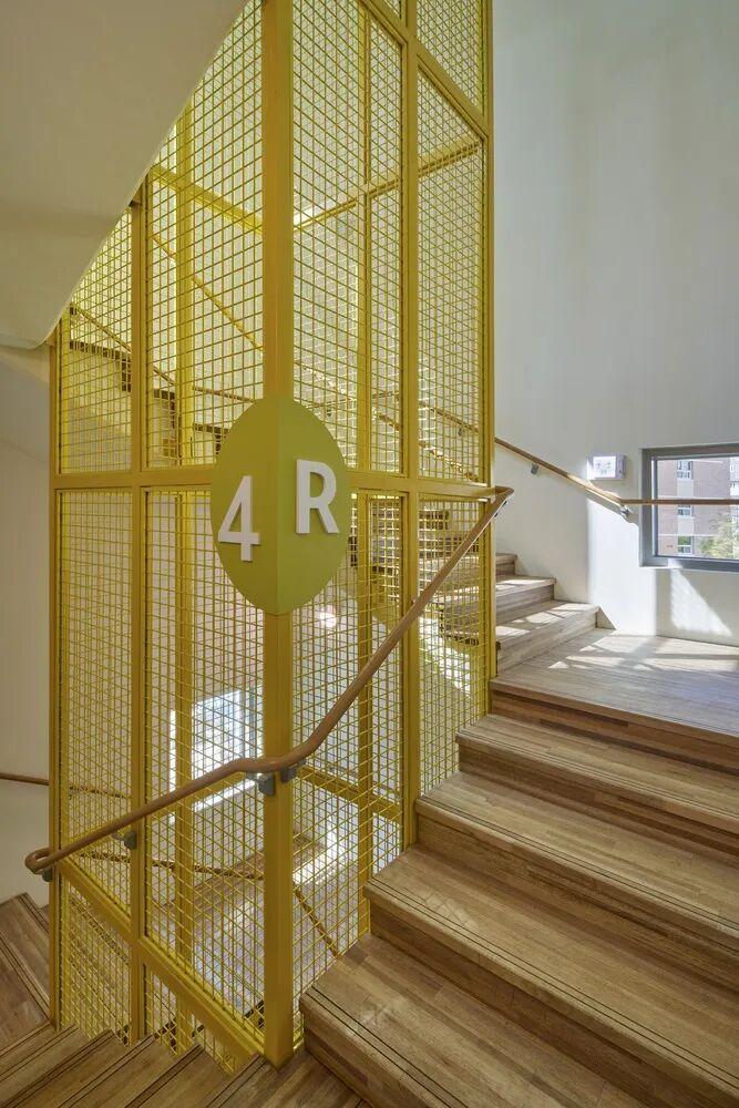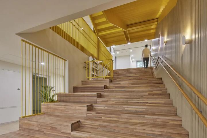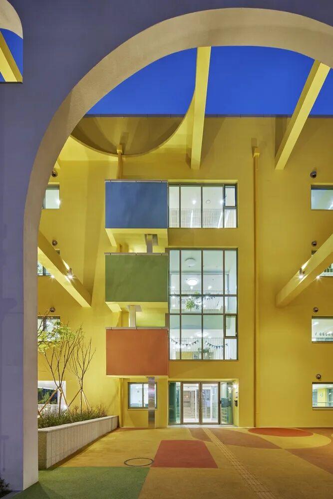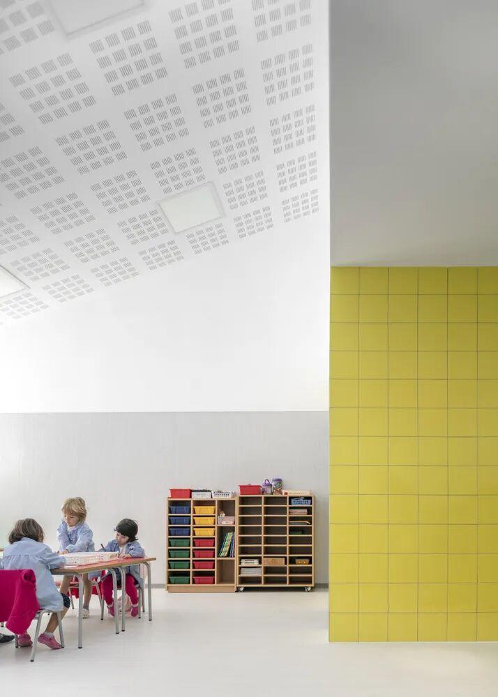 设计通过各种几何形状的不同组合使过渡空间与功能空间形成统一,鲜亮的明黄色和有趣的立面引人注目,随着太阳的东升西落,建筑所产生的明暗阴影也在不断变化,引起了孩子们的好奇心,并被称为“杰瑞的奶酪大厦”。这一具体的形象恰恰说明了空间几何对儿童想象力的激发,非结构化的空间对培养他们的创造力至关重要,这一手法不仅表现在建筑结构中,还表现在铺装和家具中,运用线条、色彩、图案构建了一个沉浸式的教育空间。