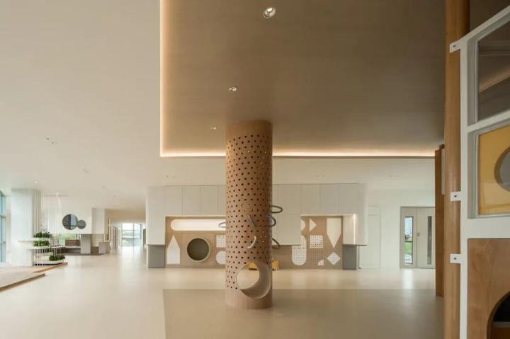 教室则扮演着“家”的角色,不再泾渭分明的布置活动室和集体卧室。我们引入了家的元素:面包砖,暖色的卫生间,带有线条的家具。教室不再是封闭的盒子,透过橱窗,可以看到自由布置的活动空间创造客厅的即视感,不光可以表达每个班级不同的个性,还让孩子们有回家的感觉。随着社会和时代的发展,传统幼儿园固有的设计模式已逐渐丧失了其适应性,该项目通过空间美学和叙事带来了具有创新性的设计,为我们打开了新的视角。