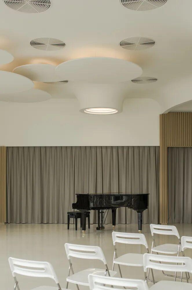 主要教学空间位于建筑的南端,共包含四个教室。每个教室都被设计成独立的教学单元,旨在促进孩子们的自主性,鼓励他们自主学习。教室内设有大面积的玻璃窗与天窗,为室内空间确保了最佳的自然通风与采光。