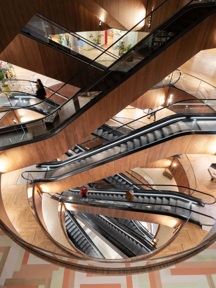 虽然第一象限的整修——包括一楼的美容部门——将在稍后阶段完全完成,但最初的启示是一个由一系列木质自动扶梯连接起来的同心六层高的空隙。OMA 扩展了 Tauentzienstra e 的主入口,游客在经过 Tauentzienstra e 和 Passauer Stra e 拐角处新建的两层楼高的植物商店橱窗后进入零售斜线活动空间。最终,每个象限都会有自己的街道入口,并且——就像这个入口——将围绕自己的核心空隙组织起来,这是垂直流通的主要手段。