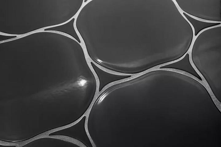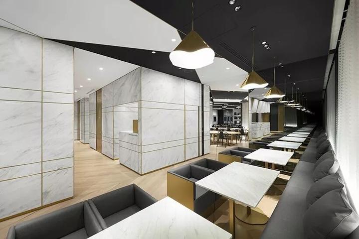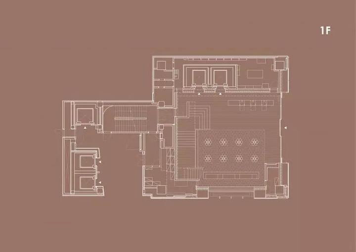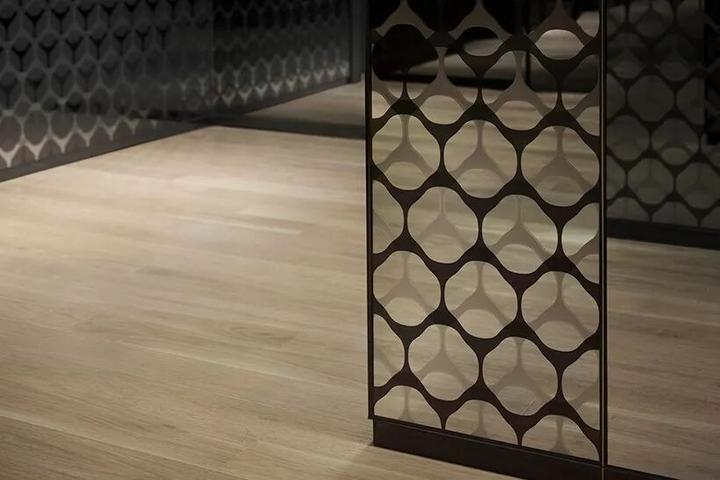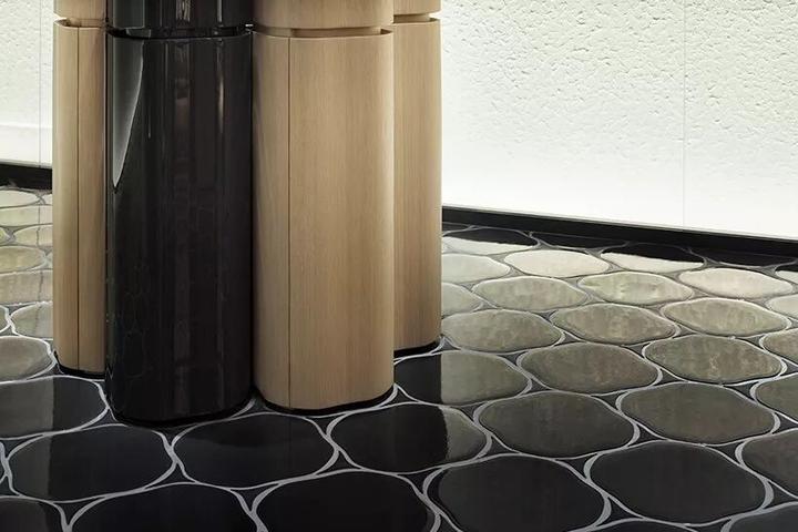 设计师设计了黑色的地坪。用山茶花的图形,从顶到地相呼应,形成空间的统一感,营造出端庄迷人的细节。