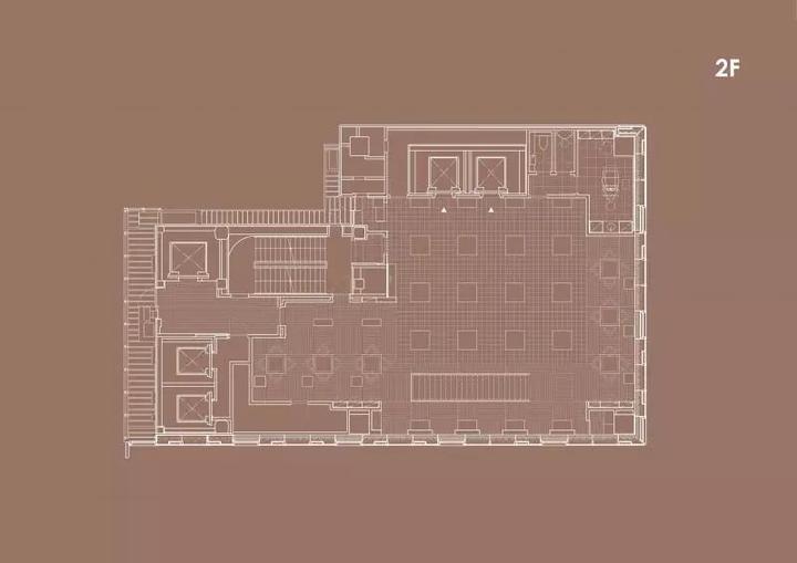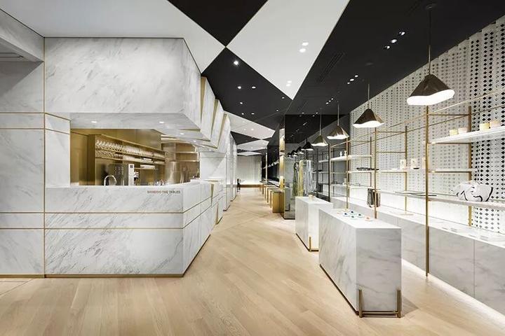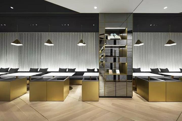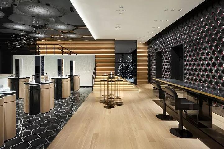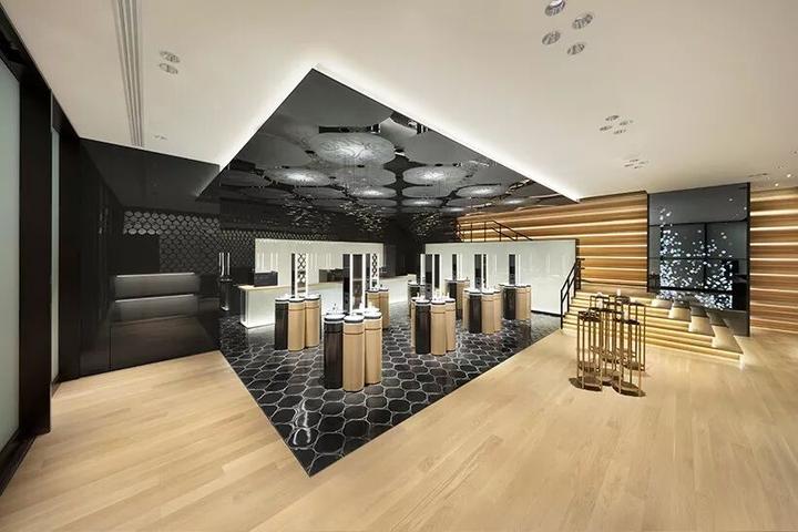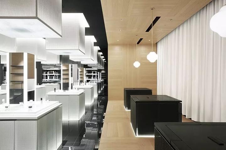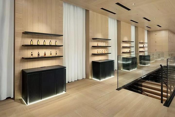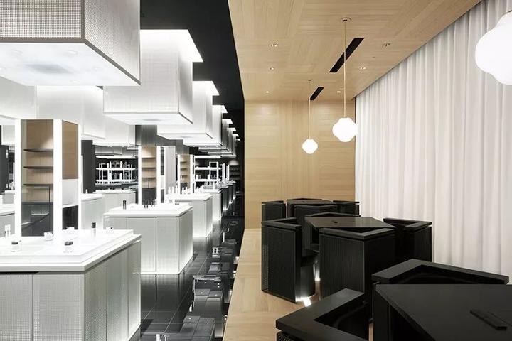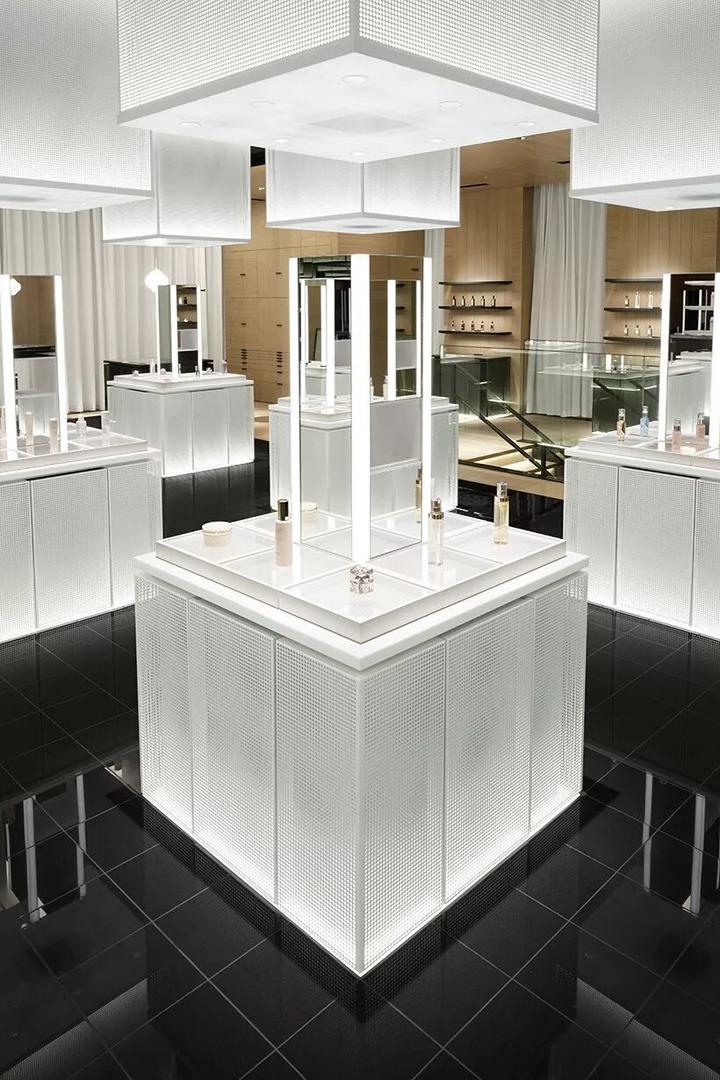 二楼的美容广场以矩阵的方式展现出来,其中包括镶嵌在木地板到天花板中的空间中的明亮点缀的化妆品和香水桌。