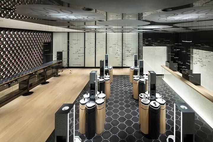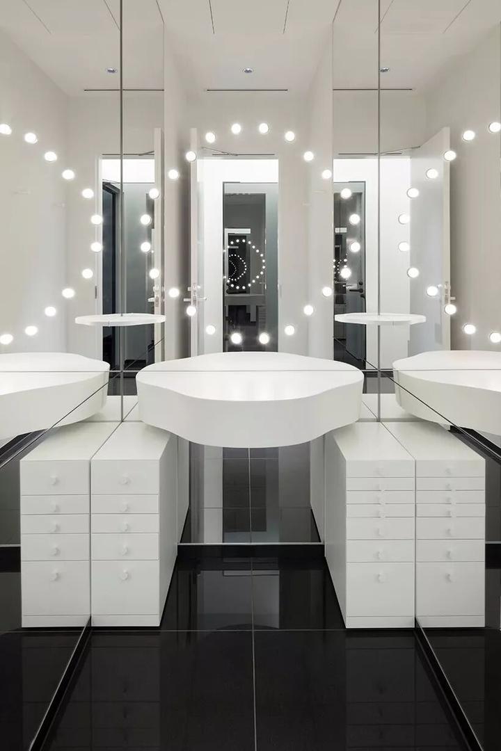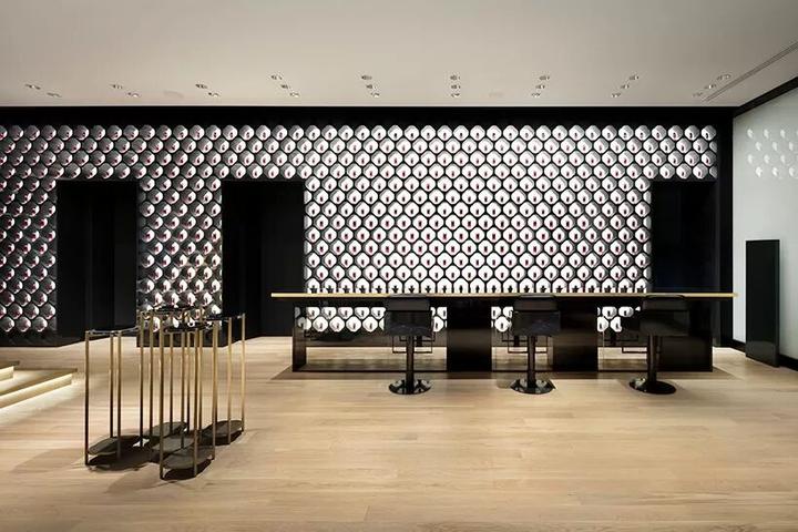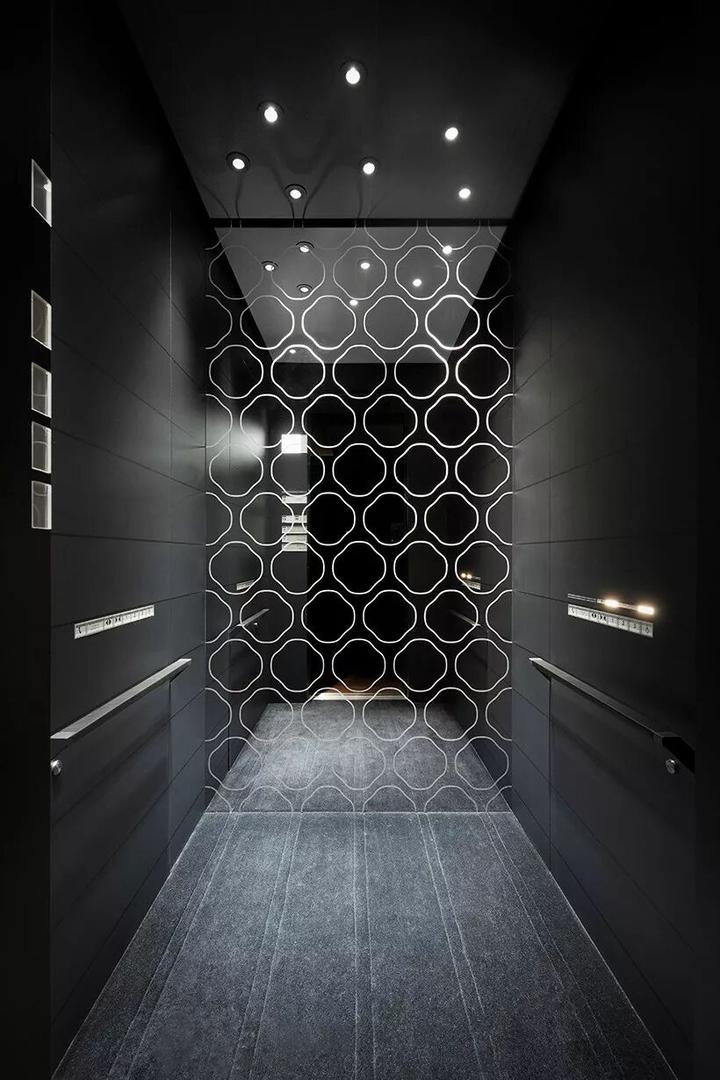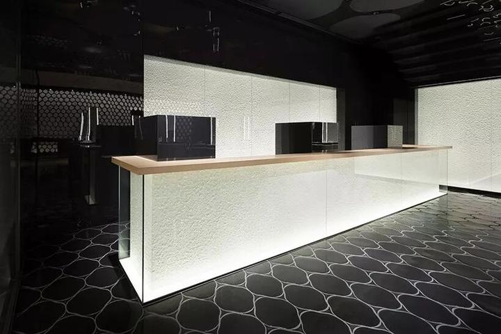 模仿化妆棉的肌理漆外面用一层清玻璃罩面,与黑色的天花和地坪的对比格外强烈。