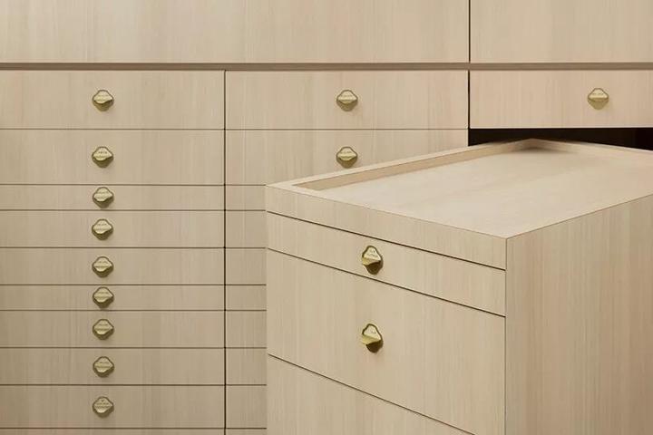 ▲造型师用的旋转橡木抽屉柜的截面图形也是山茶花形状