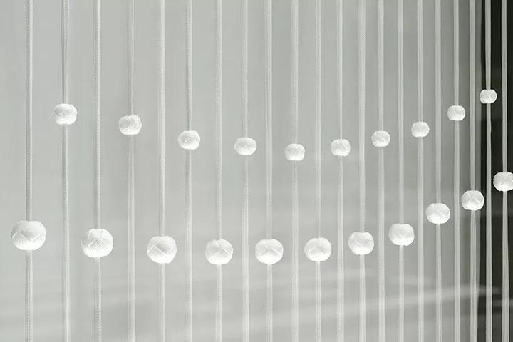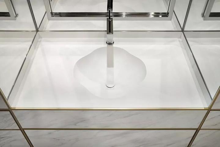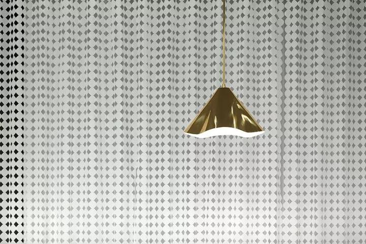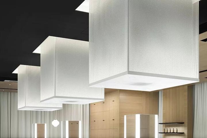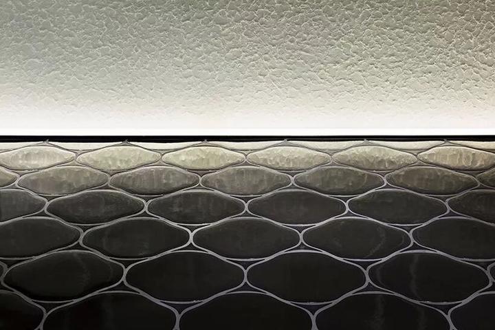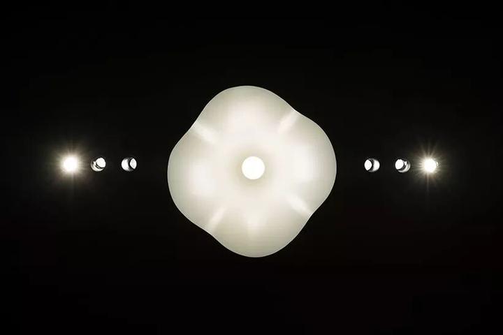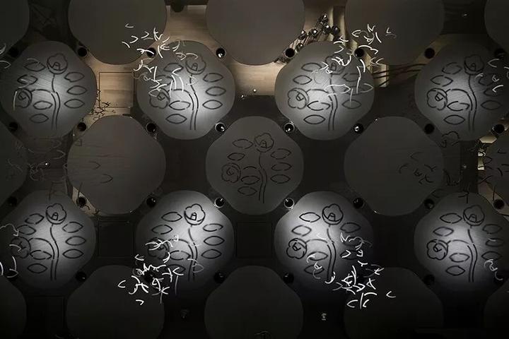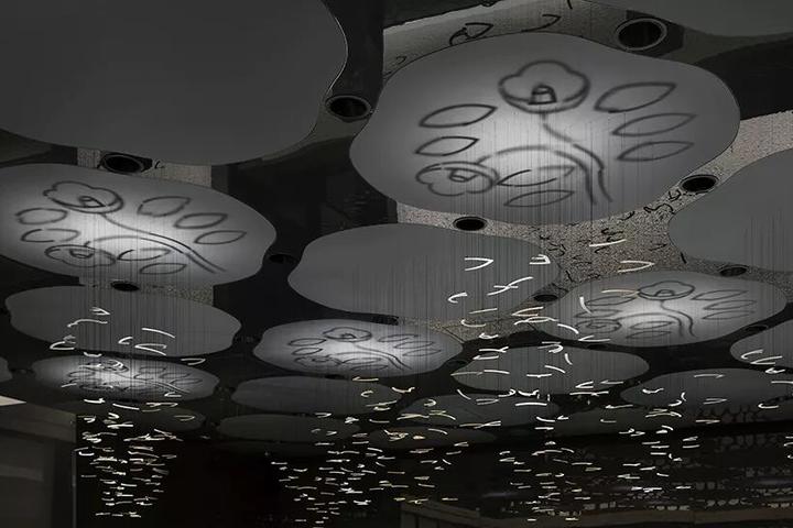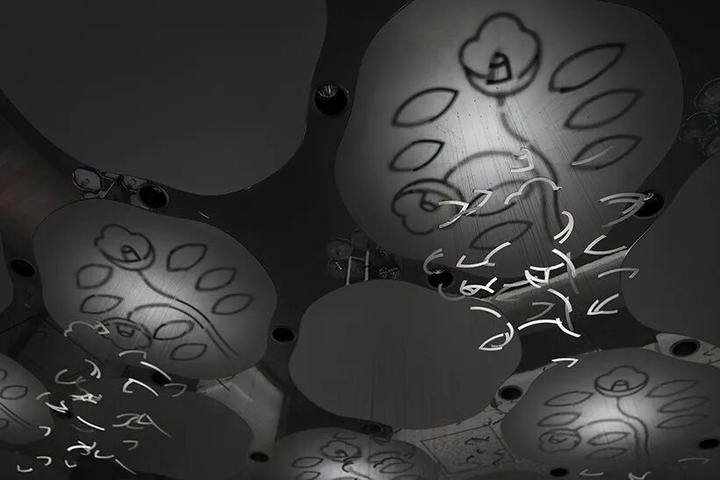 吊顶的镜像碎片是一种结合照明的装置,通过下面的灯光投射到顶部的影子,形成一个山茶花图案。这样的图案还会随着房间内空气的运动而变化。