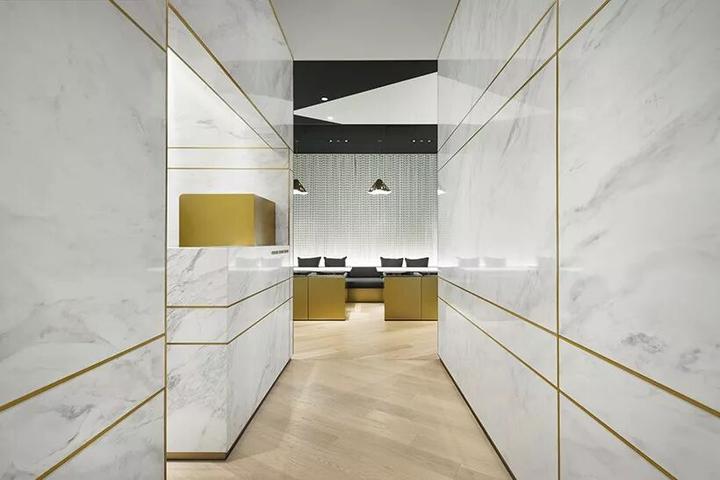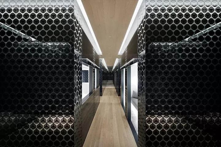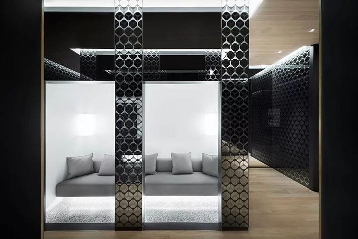 ▲走廊的花形镜墙面,内凹的空间是分区设计的等待区域。