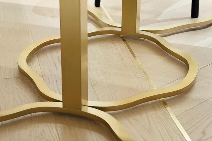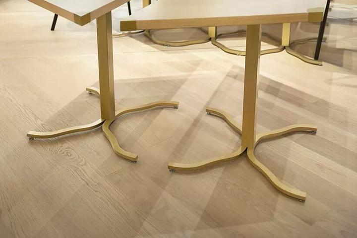 桌面的木纹有着图案拼花,桌腿的设计更是巧妙,金属支架分离和组合在一起都是图案的变形。