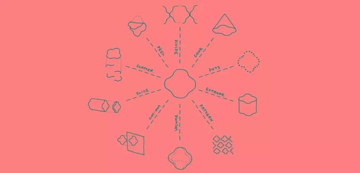 设计的核心图形采用资生堂的象征:花椿(Hanatsubaki)作为基础元素,通过镜像、分离、旋转、拉伸、扭曲、虚化等不同的构成方式进行装饰图案的再组合。