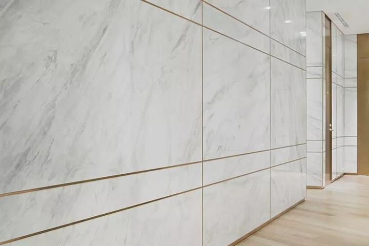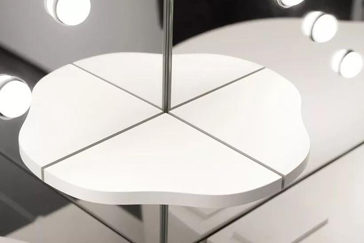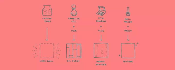 化妆棉对应的是白色的肌理墙面、山茶油的颜色非常接近于橡木饰面,眼影像白色大理石的纹理、指甲油则是亮面的高光板。