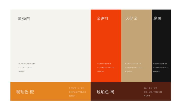 在配色方面,hfp基于品牌调性选择了蛋壳白、亲密红、大促金为主色调,琥珀色和炭黑为辅助色展开,视觉上给人柔和、温暖之感。
