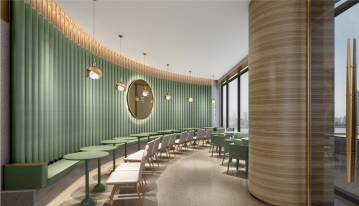 “茶山”元素甚至延伸到了休息区,它将整个一层店面严实地包裹了起来,让顾客从一进门,就能感受到茶山层叠不绝的唯美意境。