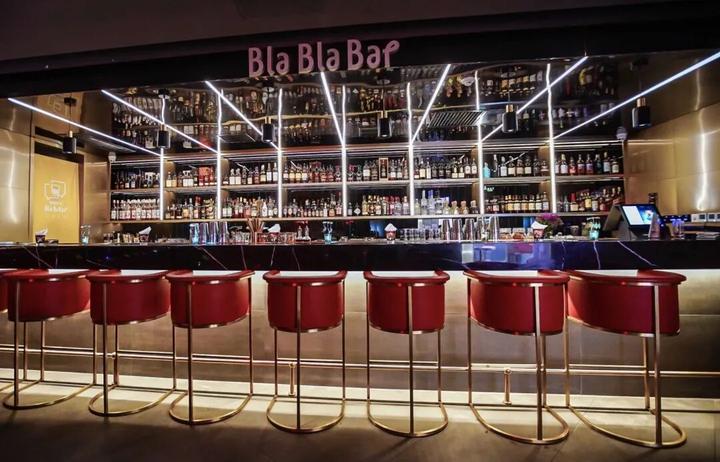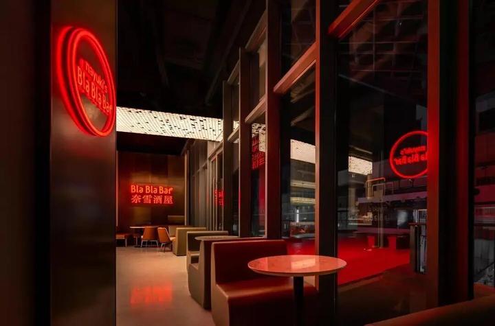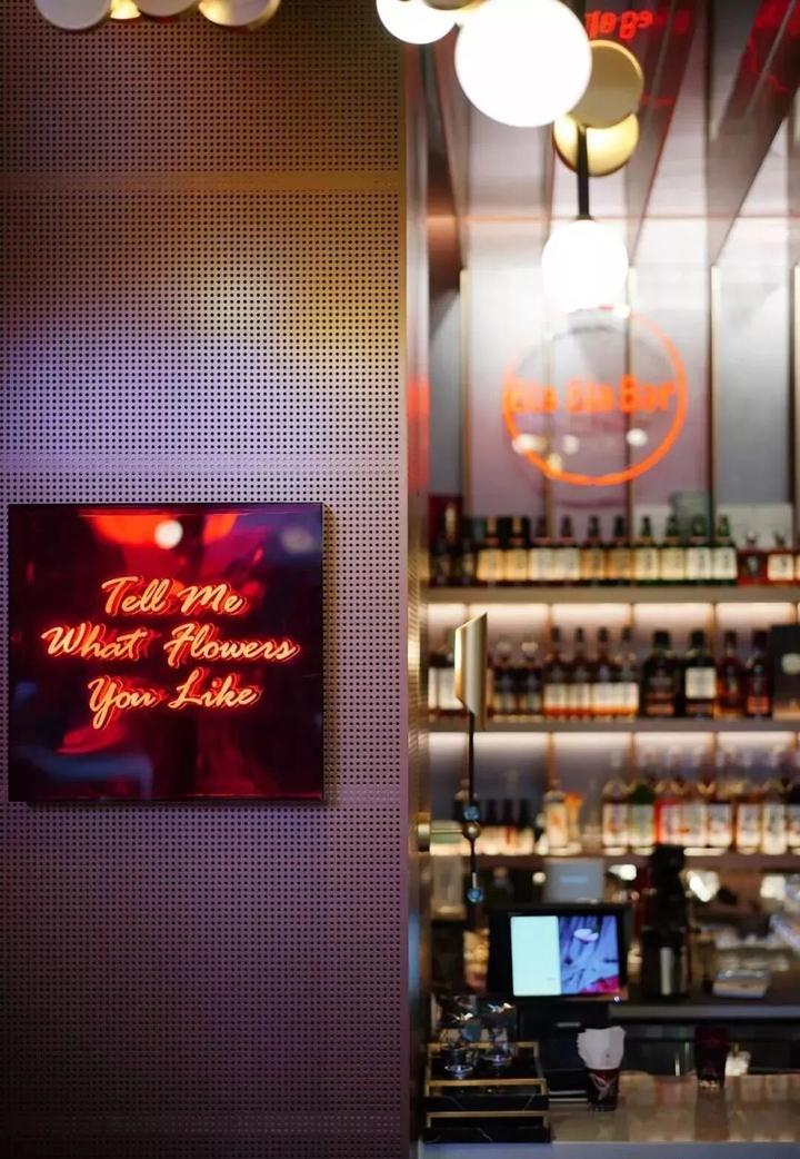 红色霓虹灯和暖色神秘光带,配上古铜色的家具,似乎将《银翼杀手2049》的赛博朋克场景搬进了现实。