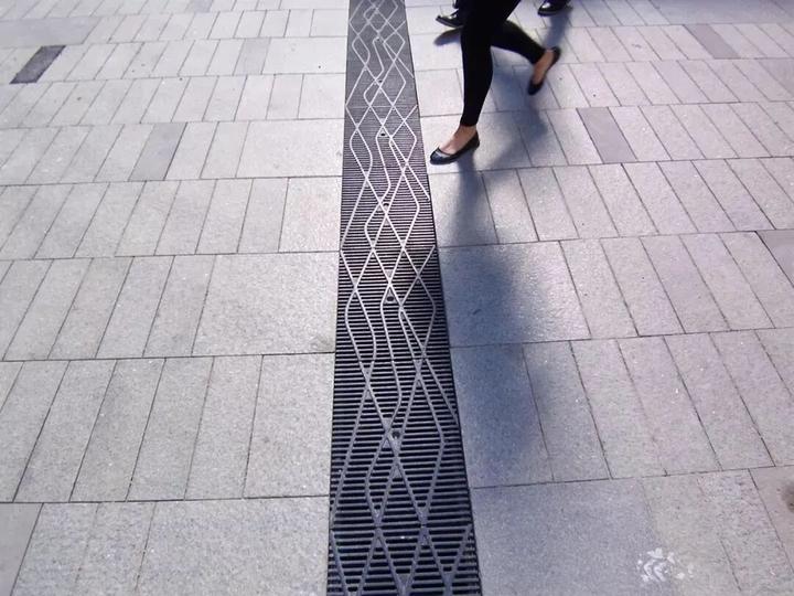 设计创造了一个开放和宽敞的公共场所覆盖五个视觉坚强的设计元素,即:波形图案花岗岩路面,非对称放置的圆棕榈,线性水功能,架空线安装照明系统,独特的定制设计座椅。