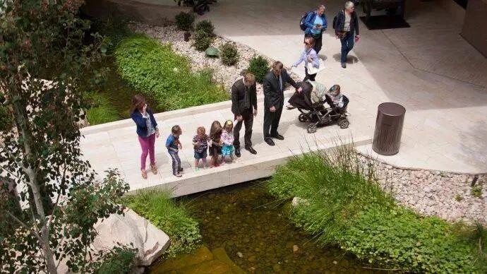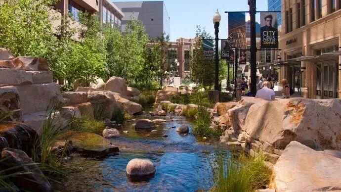 购物中心有一条长一公里的人造溪流,沿着步行为主导的绿色空间蜿蜒成“S”形,让人回想起1847年盐湖城成立的历史。