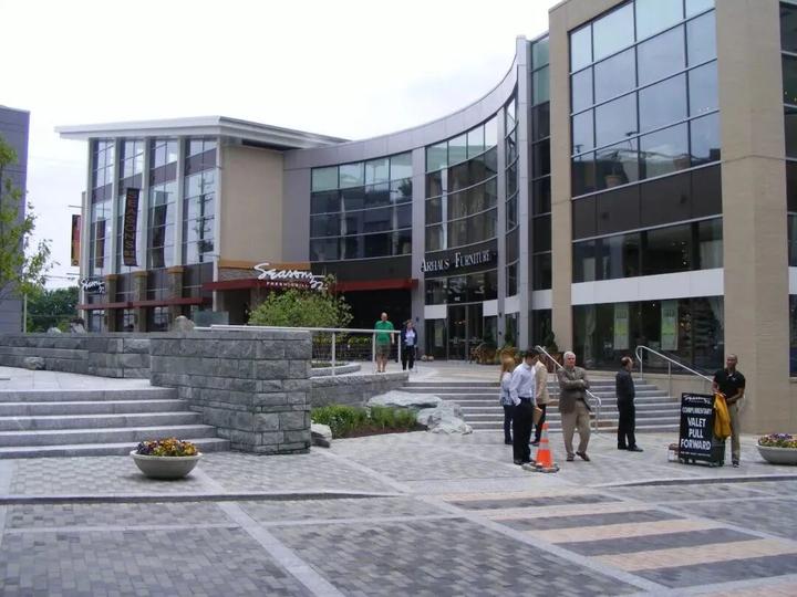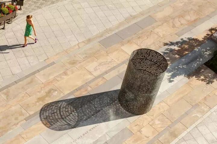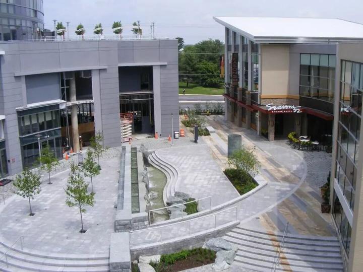 纳尔逊·伯德·沃尔茨(Nelson Byrd Woltz)设计了与该项目相关的所有公共室外空间,包括中央广场、户外市场的节日街道和项目周边的街景。该设计考虑了当地地理、地质和生态学的情况。广场中心的喷泉设计模仿了瀑布,条纹石铺路是对该地区典型的沉积基岩的体现。街道广场上的种植参考了该地独特的生态系统,同时还安装了一个专门针对当地文化自然和文化历史的铜像和石雕。
