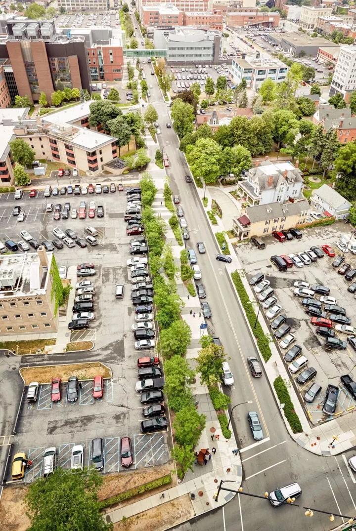 该校园街道有着强大的植被覆盖,长角种植床最大限度地增加植树面积,同时尊重现有大型树木的根部区域。分层的植被系统在冷却空间时增加了渗透性。灌木层、下层植树和冠层植树是由本地和城市适应的物种组成的,对布法罗的严冬和盐渍制度具有高度的耐受性。