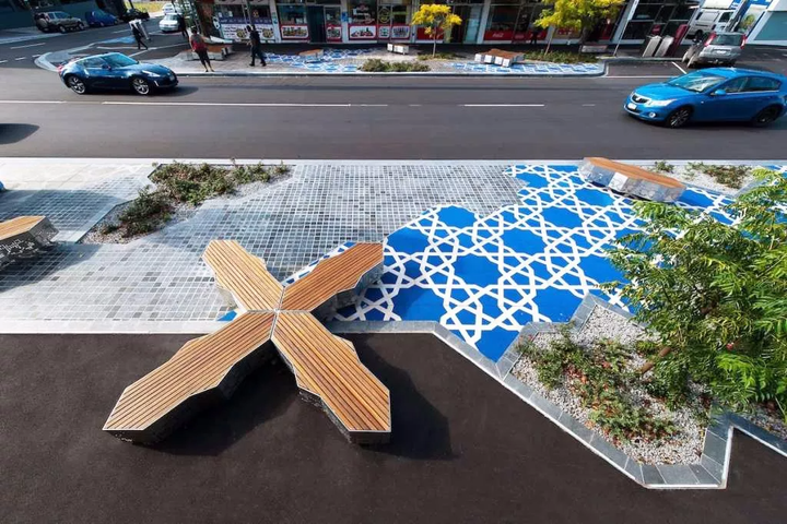 马扎沙里夫清真寺(即蓝色清真寺)中精妙绝伦的花砖拼贴是设计主要的灵感来源。设计团队对其的现代诠释为创造出“几何形聚会”的设计手法。街道的两边均使用细节复杂的地面铺装,并用颜色、质感以及图案来划分出主要的聚会地点。抽象的几何形状扩大形成街景元素的排布及形态,在片区的核心区域则通过叠加密集的方式着重描绘。