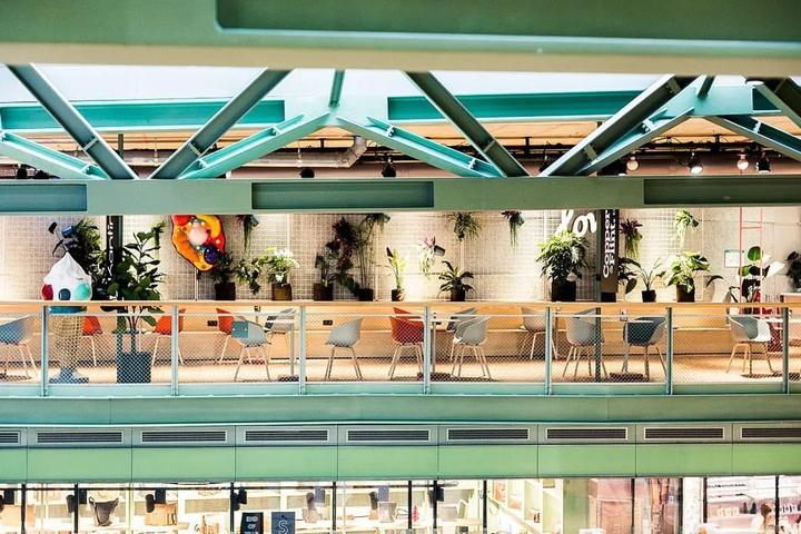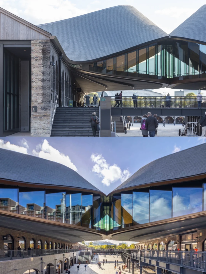 为吸引并与消费者产生黏性,商场旨在引领年轻人新生活方式,在商业空间内频繁举办伦敦时装周、快闪店等线下文艺活动,丰富城市年轻人的业余生活。此外,设计师将两座屋顶向高处伸展直至交汇,形成一个公共庭院。在抬高的屋顶下方,形成了一个 20 米高、宽敞的遮蔽空间,人们可以在这里散步、停歇或举办音乐会和表演活动。而在屋顶上方,游客可以俯瞰到南面的国王十字车站和克里克研究所,以及位于北面的Cubitt广场,是人们下班后放松发呆的好去处。
