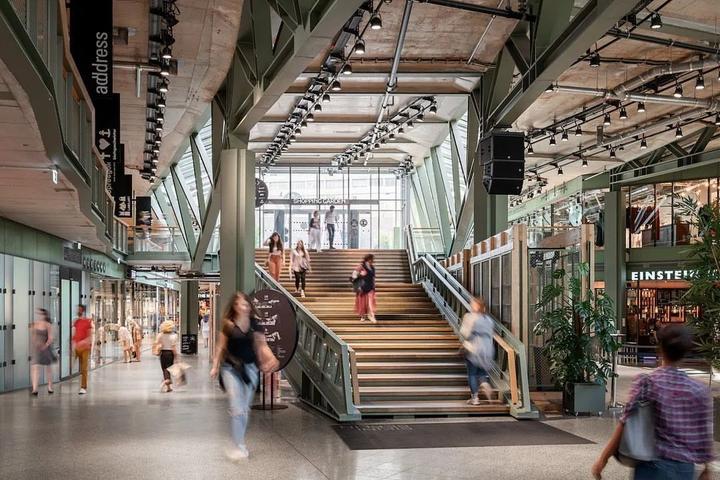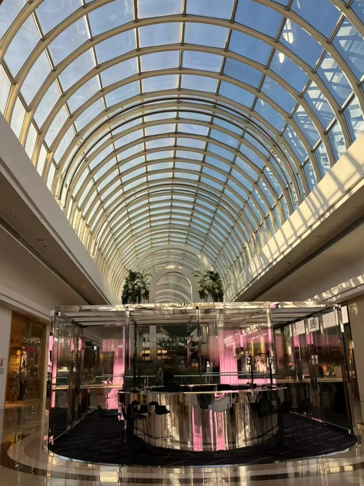 它的改造以人性化尺度与功能复合化为核心。典型案例是2019年落成的“The Link”步行道:这一项目将原多层停车场改造为110米长的拱形玻璃连廊,采用弯曲胶合木结构与半透明PTFE织物,既呼应了购物中心标志性的拱形玻璃屋顶,又通过自然采光与绿植覆盖,营造出通透的生态空间。