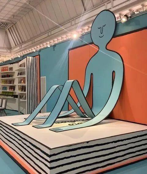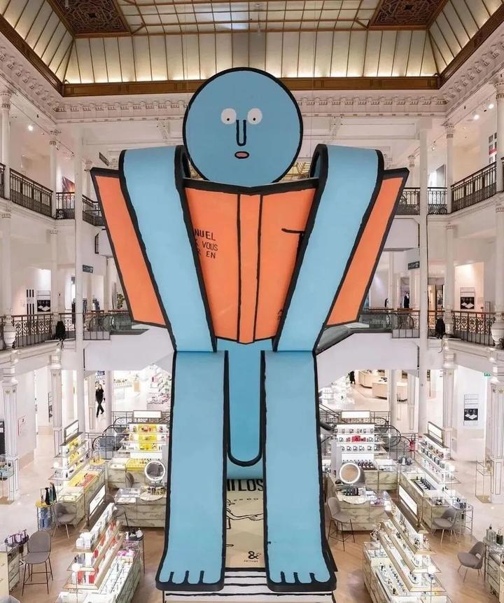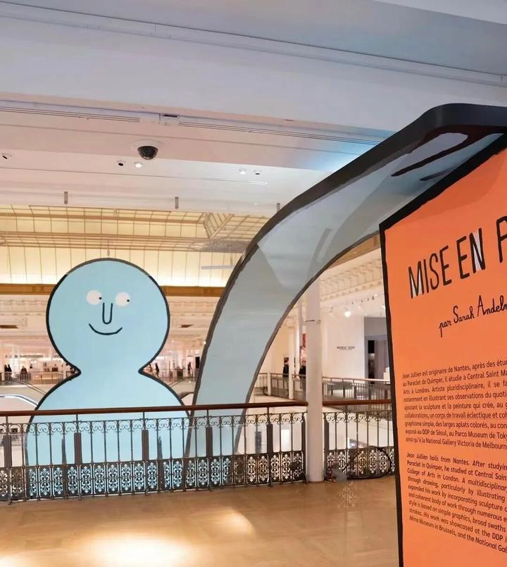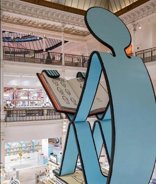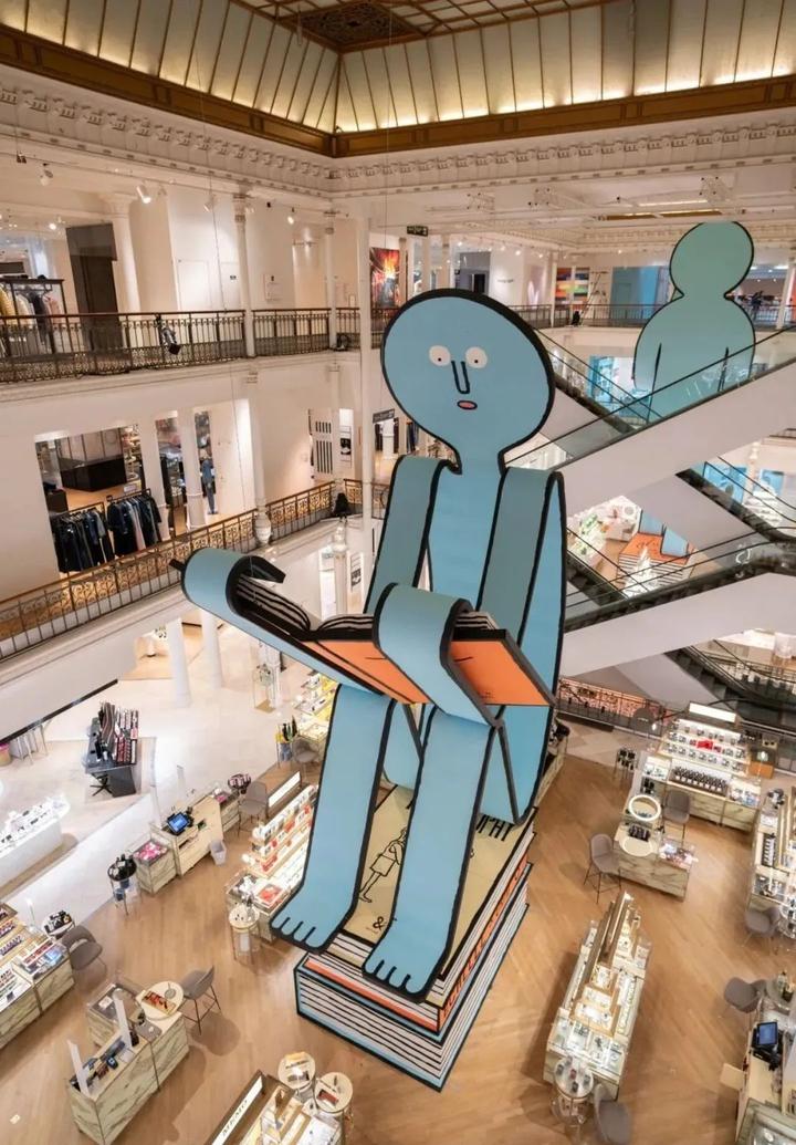 2024年2月,Jean Jullien创作的两个蓝色纸人巨型装置,一个全神贯注于阅读书籍,而另一个则伸展其波动的手臂向着建筑的阳台,超乎寻常的巨型书本,以及充满趣味的脸孔,为空间增添活力。